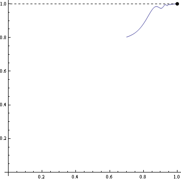 Plot[-(x - 1)^2 (2 + Sin[1/(x - 1)]) + 1, {x, 0.7, 1}, AxesOrigin -> {0, 0}, AspectRatio -> 1, Epilog -> {PointSize[0.02], Point[{1, 1}], Dashed, Line[{{1, 1}, {0, 1}}]}]